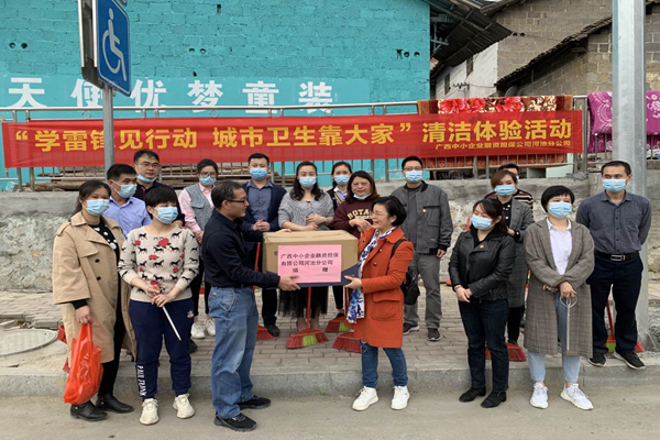河(hé)池分公司組織志(zhì)願者到金城江街(jiē)道(dào)體(tǐ)育館至維六村委一帶街(jiē)道(dào)進行(xíng)大(dà)清掃。勞動結束後,分公司向當地環衛站(zhàn)捐贈口罩2000個(gè),向環衛一線人(rén)員緻敬。